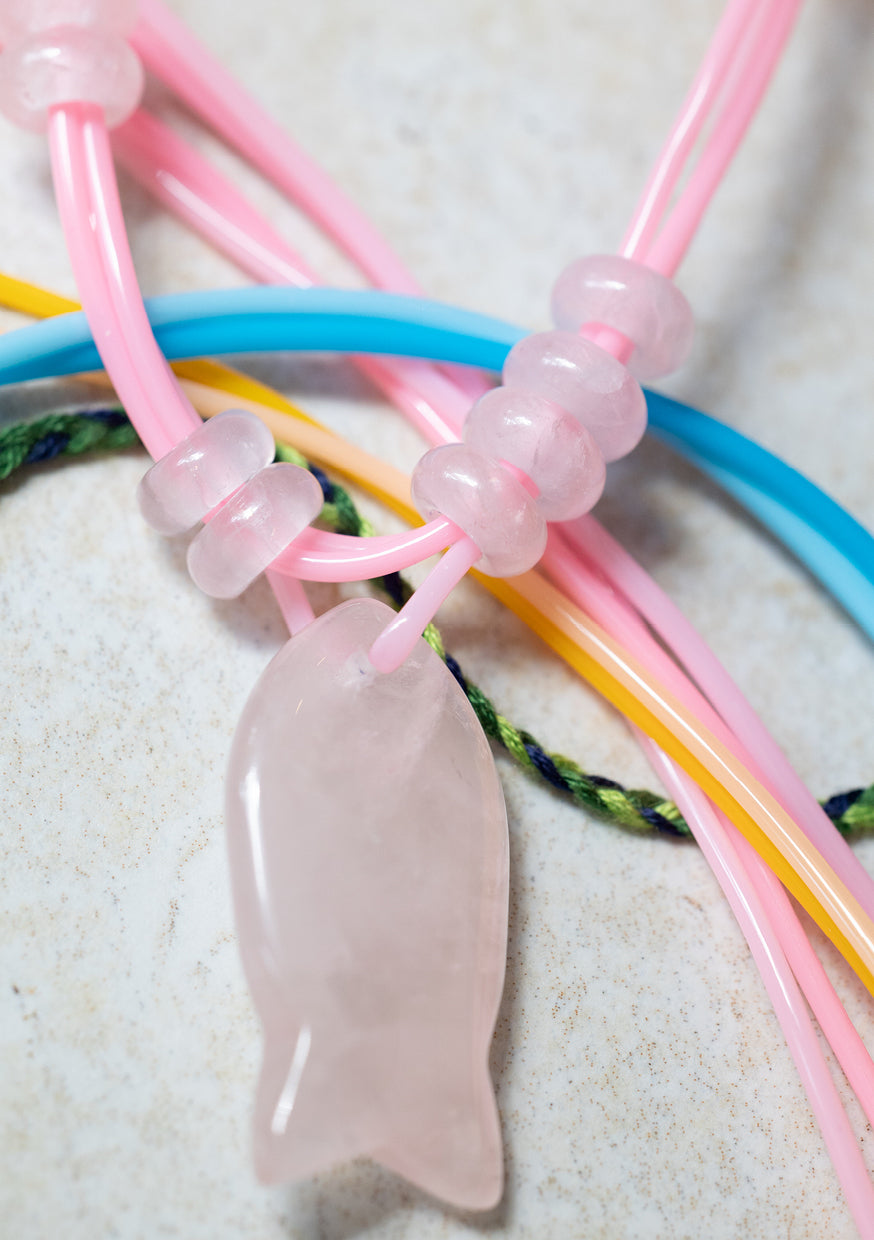 Thoughtfully handcrafted, this necklace features a delicately carved fish pendant — a symbol of peace, resilience, and tropical freedom — paired with Rose Quartz or Malachite, both crystals of inner wisdom, love and emotional healing.