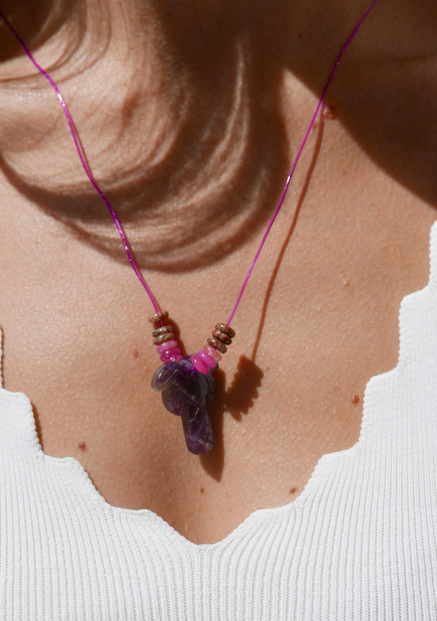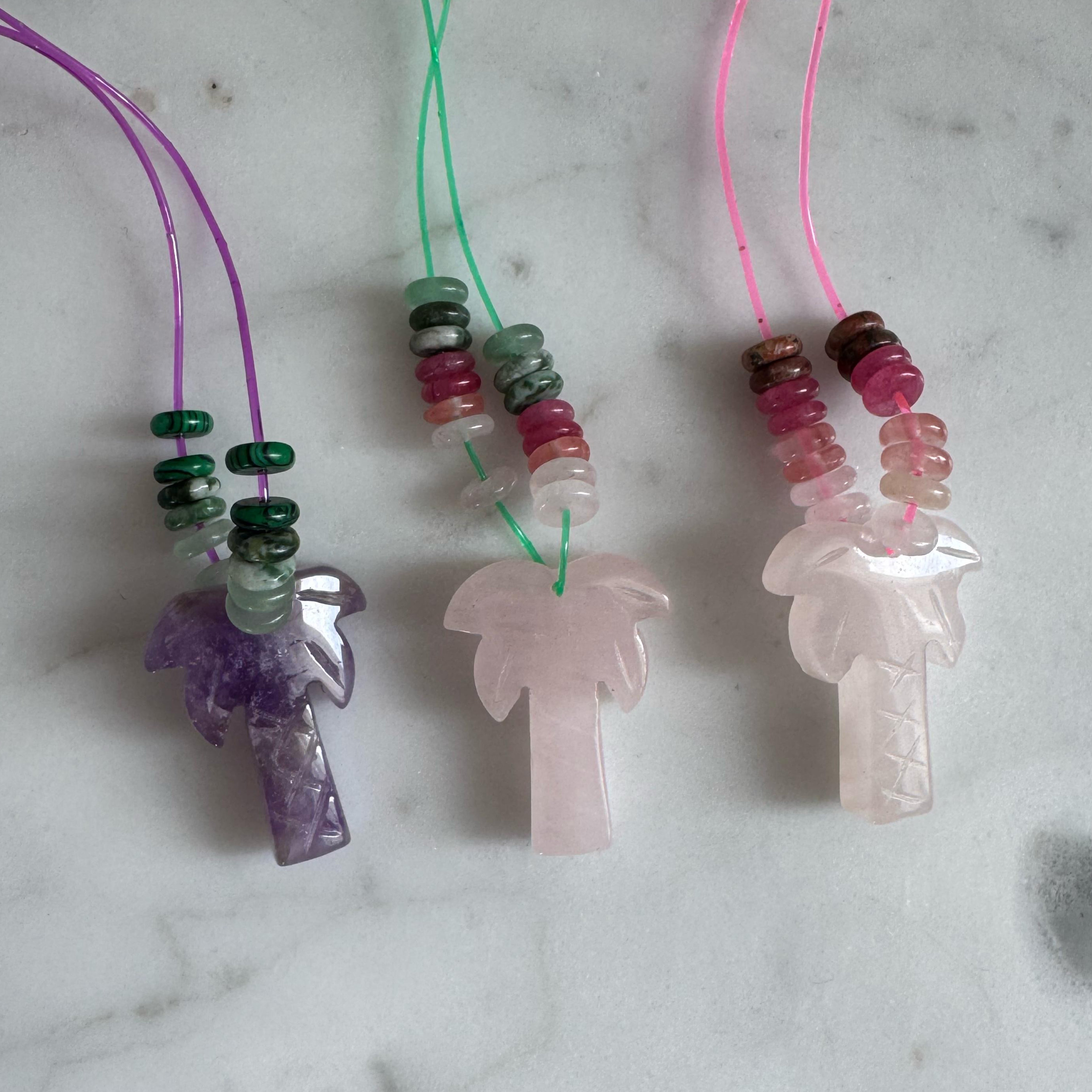 Thoughtfully handcrafted, this necklace features a delicately carved palm tree pendant — a symbol of peace, resilience, and tropical freedom — paired with Rose Quartz or Amethyst, both crystals of inner wisdom, love and emotional healing.