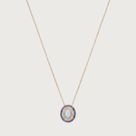 Oval clip pendant featuring a Blue centre Opal highlighted by 2 halos of Aquamarines and Blue Sapphires set in 18K Yellow, White or Rose Gold. Sold with an 18K Yellow, White or Rose Gold chain and earring extension, the Alice can be worn as a necklace, a bracelet, a wrap-around hand jewel or as an earring drop (combined with your own earring stud).