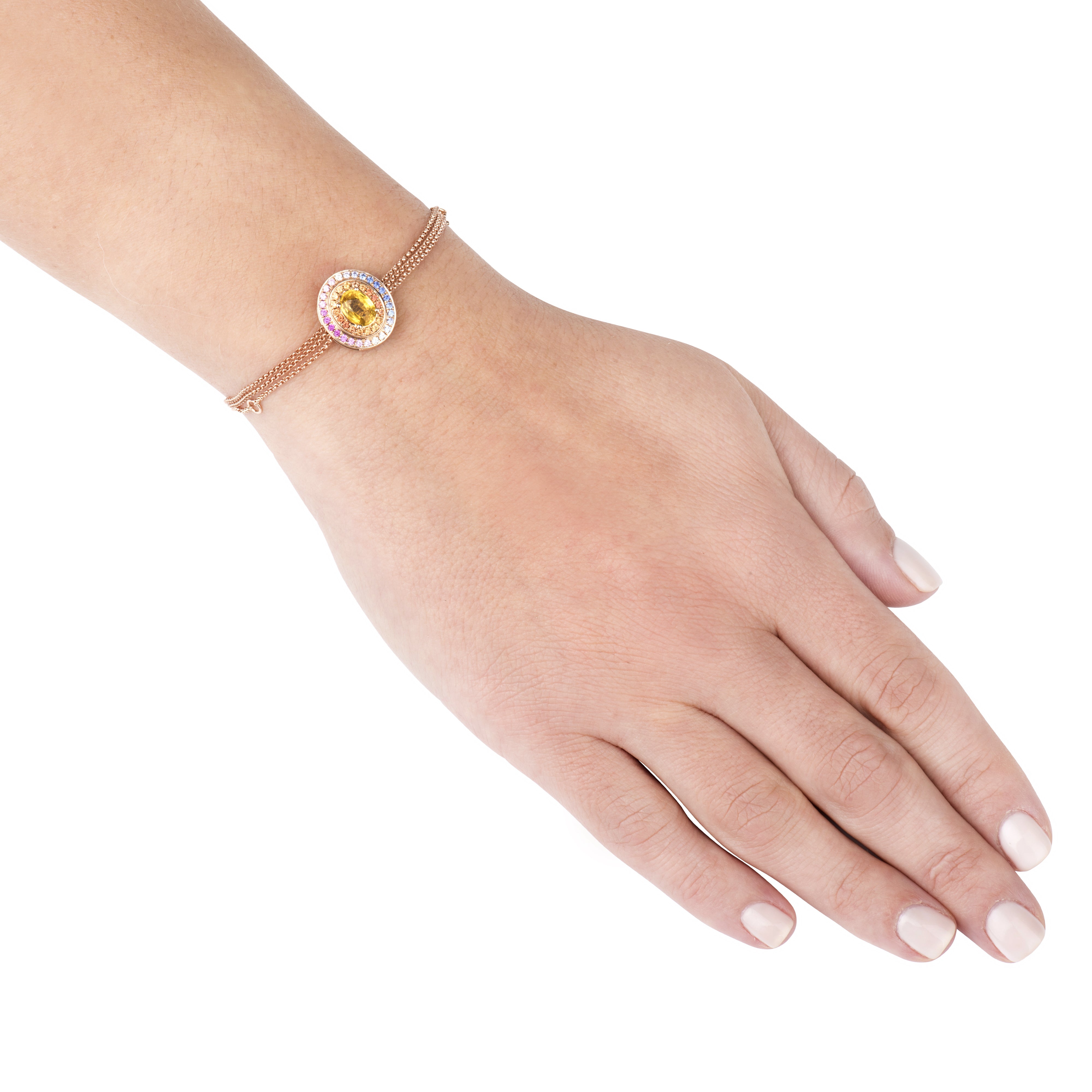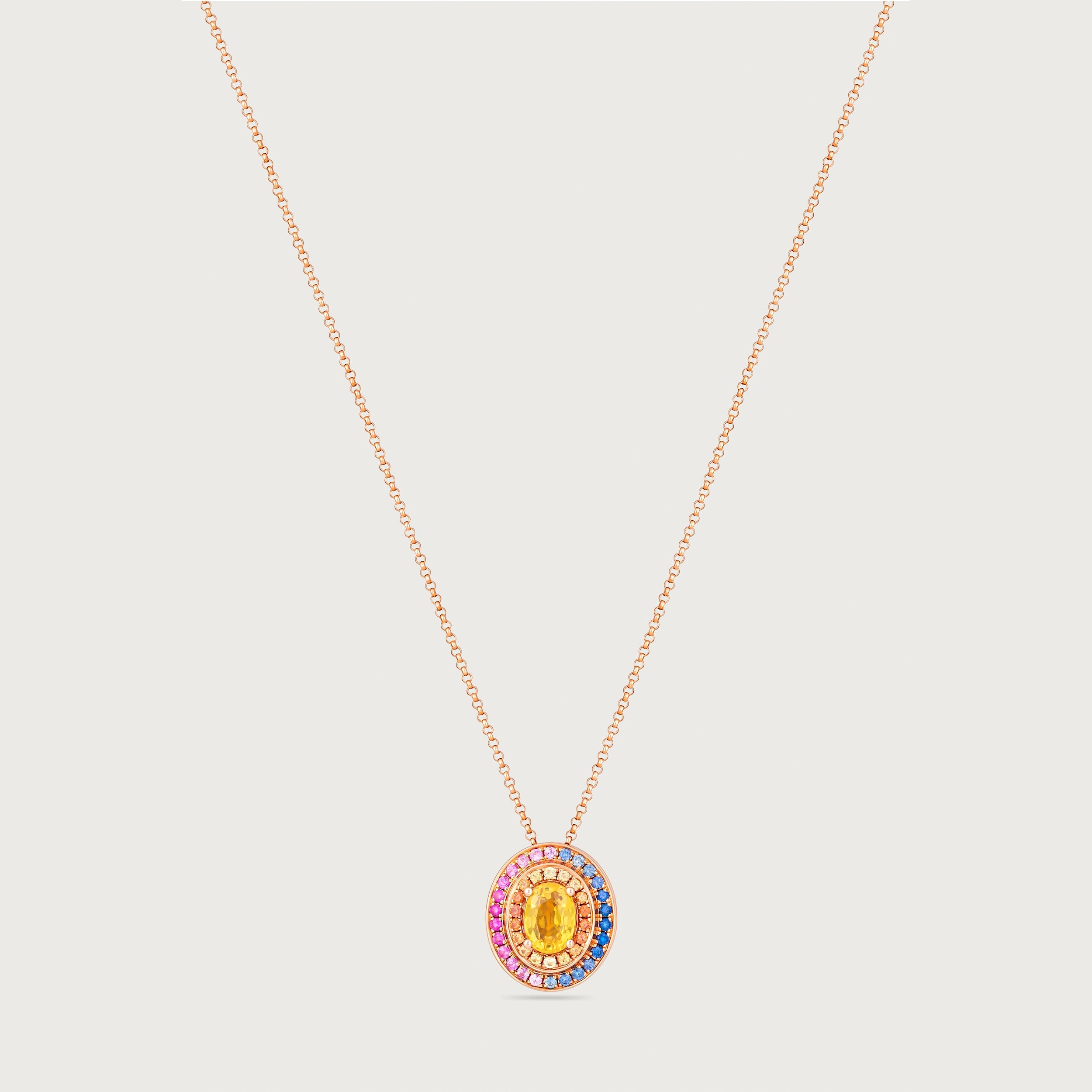 Oval clip pendant featuring a Yellow Sapphire centre stone highlighted by 2 halos of multicolour Sapphires set in 18K Rose Gold. Sold with an 18K Rose Gold chain and earring extension, the Alice can be worn as a necklace, a bracelet, a wrap-around hand jewel or as an earring drop (combined with your own earring stud).