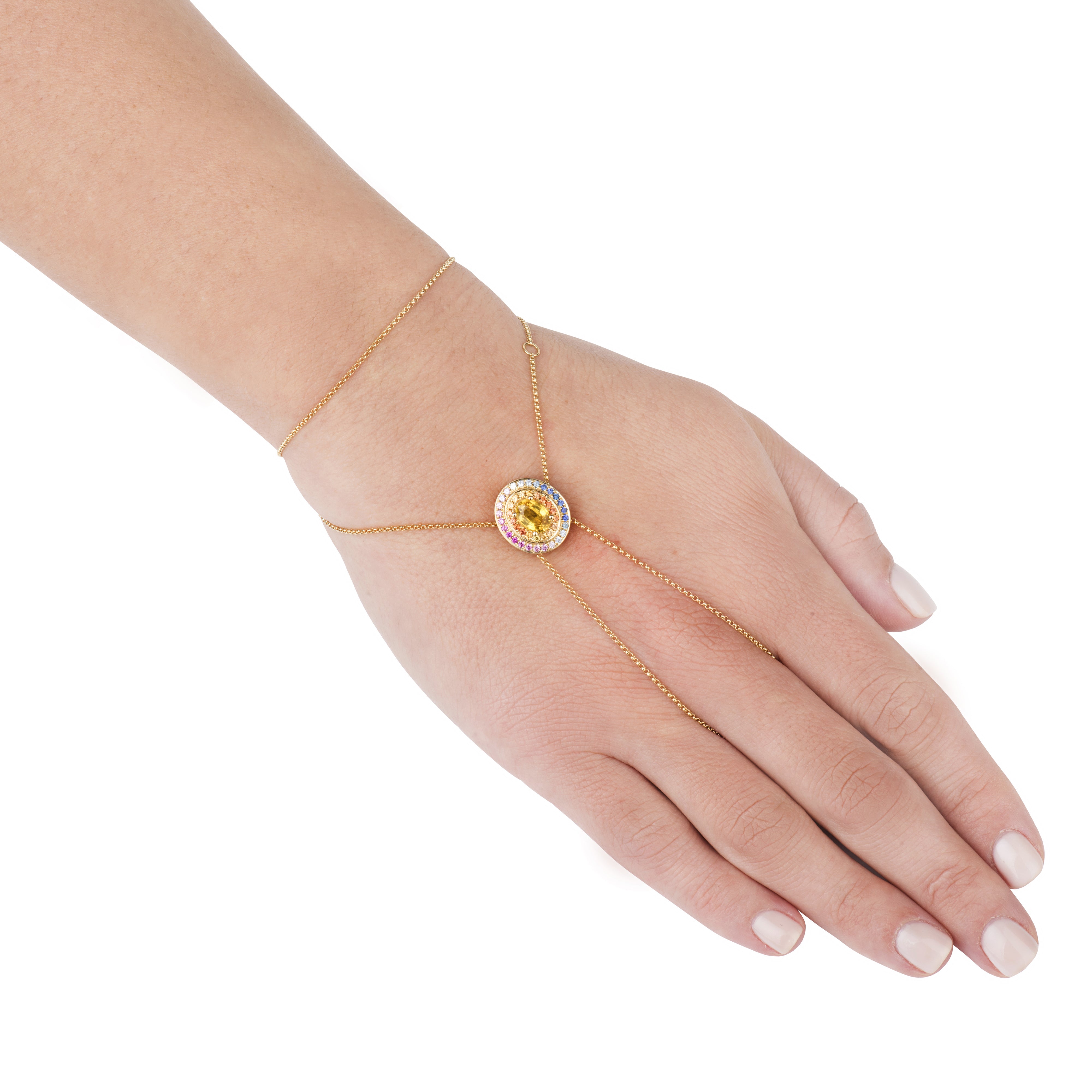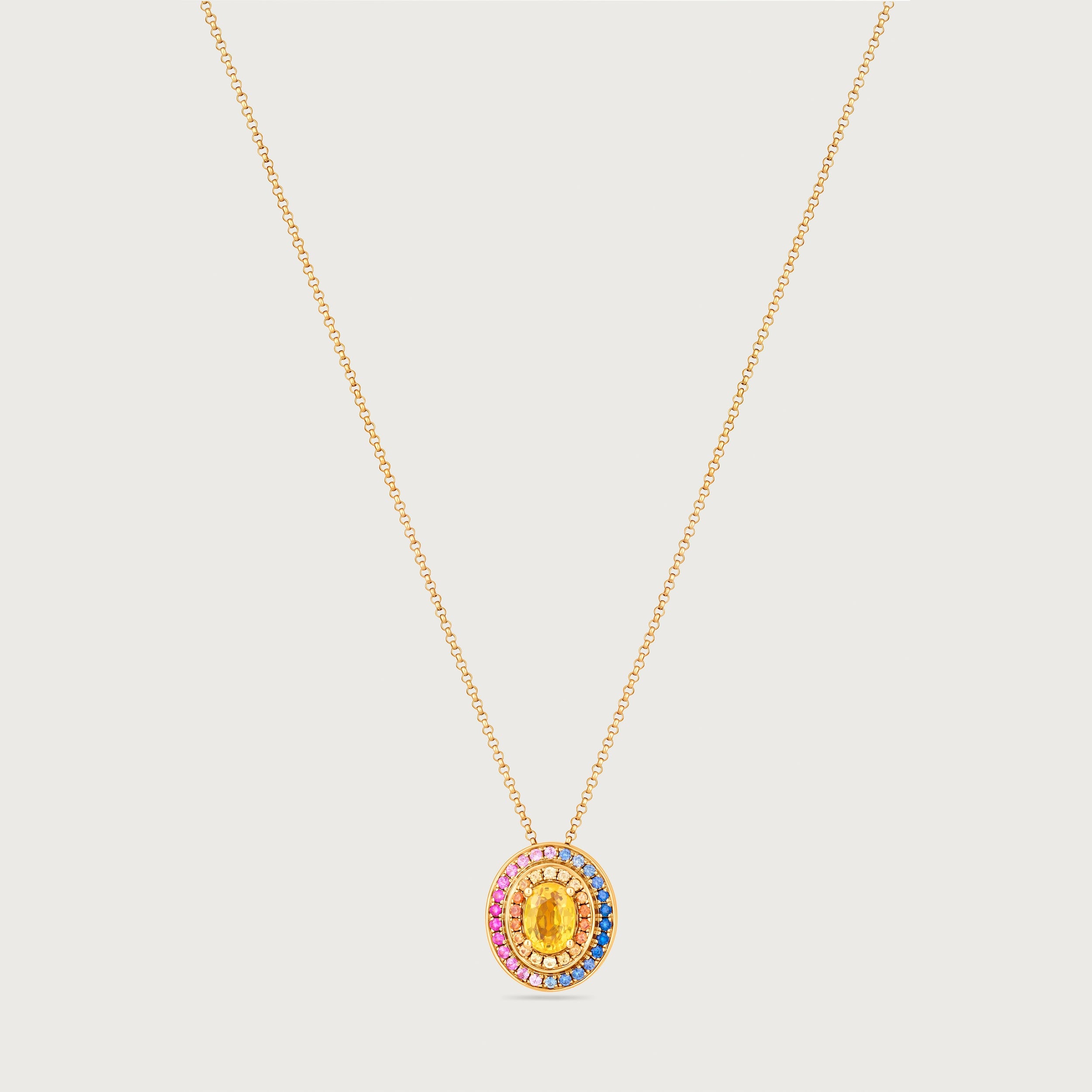 Oval clip pendant featuring a Yellow Sapphire centre stone highlighted by 2 halos of multicolour Sapphires set in 18K Yellow Gold. Sold with an 18K Yellow Gold chain and earring extension, the Alice can be worn as a necklace, a bracelet, a wrap-around hand jewel or as an earring drop (combined with your own earring stud).