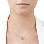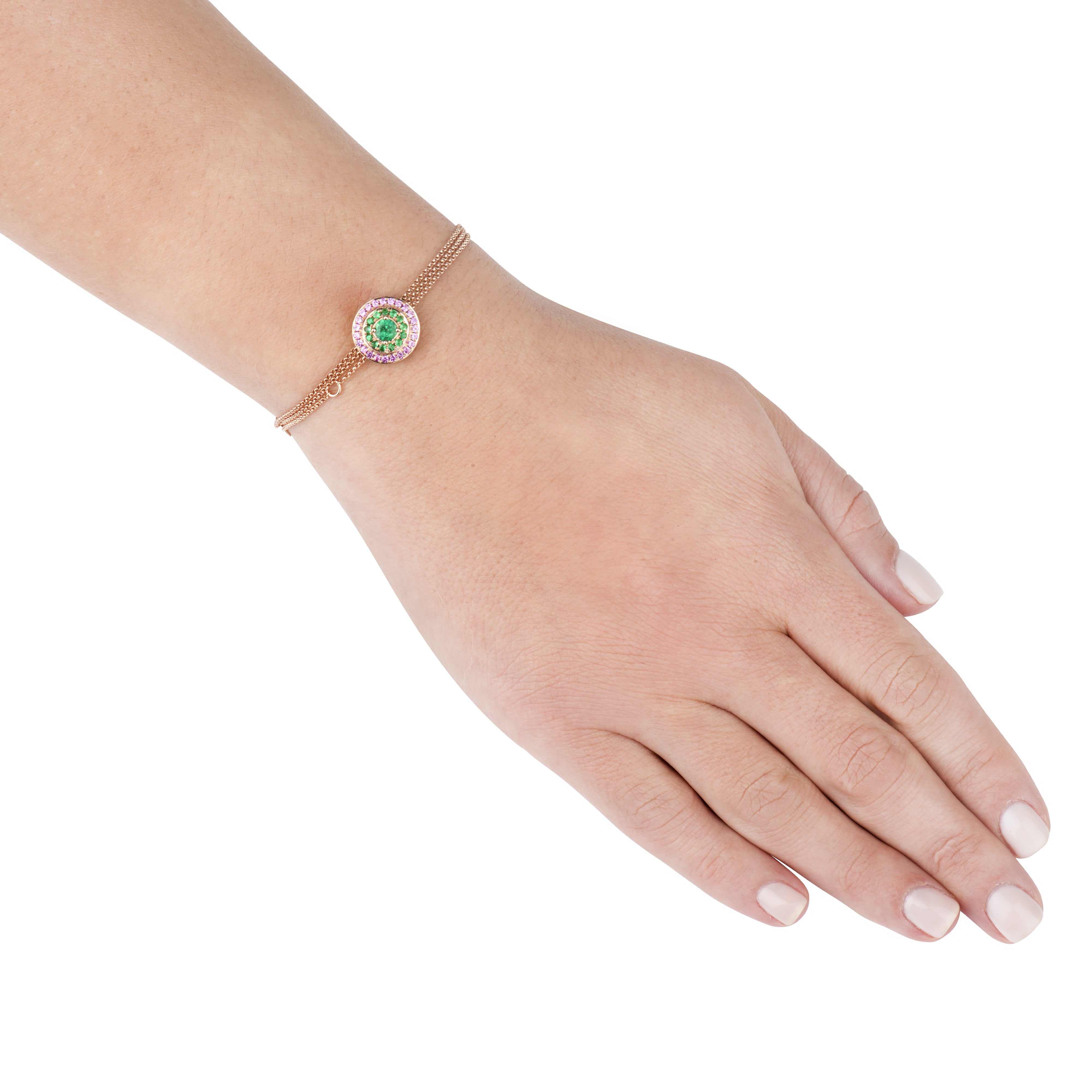 Round clip pendant featuring an Emerald centre stone highlighted by 2 halos of Emeralds and Pink Sapphires set in 18K Rose Gold. Sold with an 18K Rose Gold chain and earring extension, the Alice can be worn as a necklace, a bracelet, a wrap-around hand jewel or as an earring drop (combined with your own earring stud).