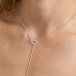 18K White Gold lariat necklace featuring an Eye set with White Diamonds. At the end of the drop chain sits a pendant set with 7 stones - Diamond, Aquamarine, Sapphire, Amethyst and Iolite. The adjustable chain allows you to wear the necklace close to the throat or loose.