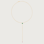 18K White, Yellow or Rose Gold lariat necklace featuring an Emerald at the centre. At the end of the drop chain sits a pendant set with 7 stones - Diamond, Sapphire, Aquamarine, Ruby and Garnet. The adjustable chain allows you to wear the necklace close to the throat or loose.