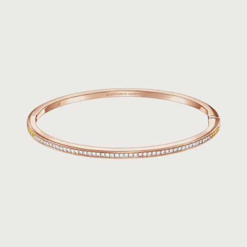18K Yellow, White & Rose Gold bangle set with Diamonds on one half and 5 Yellow Sapphires on each side. Featuring our signature invisible clasp, this bracelet is seamlessly secure. Its oval shape sits comfortably around the wrist and will be rarely taken off.