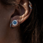 The Journey Hoop 18k white gold set with diamonds and blue sapphire reminds us of the cool elegance of white gold that seamlessly evolves from shimmering white diamonds into the serene blue of sapphires. This piece symbolizes the journey of nurturing self-love, the only foundation where another’s love can truly blossom