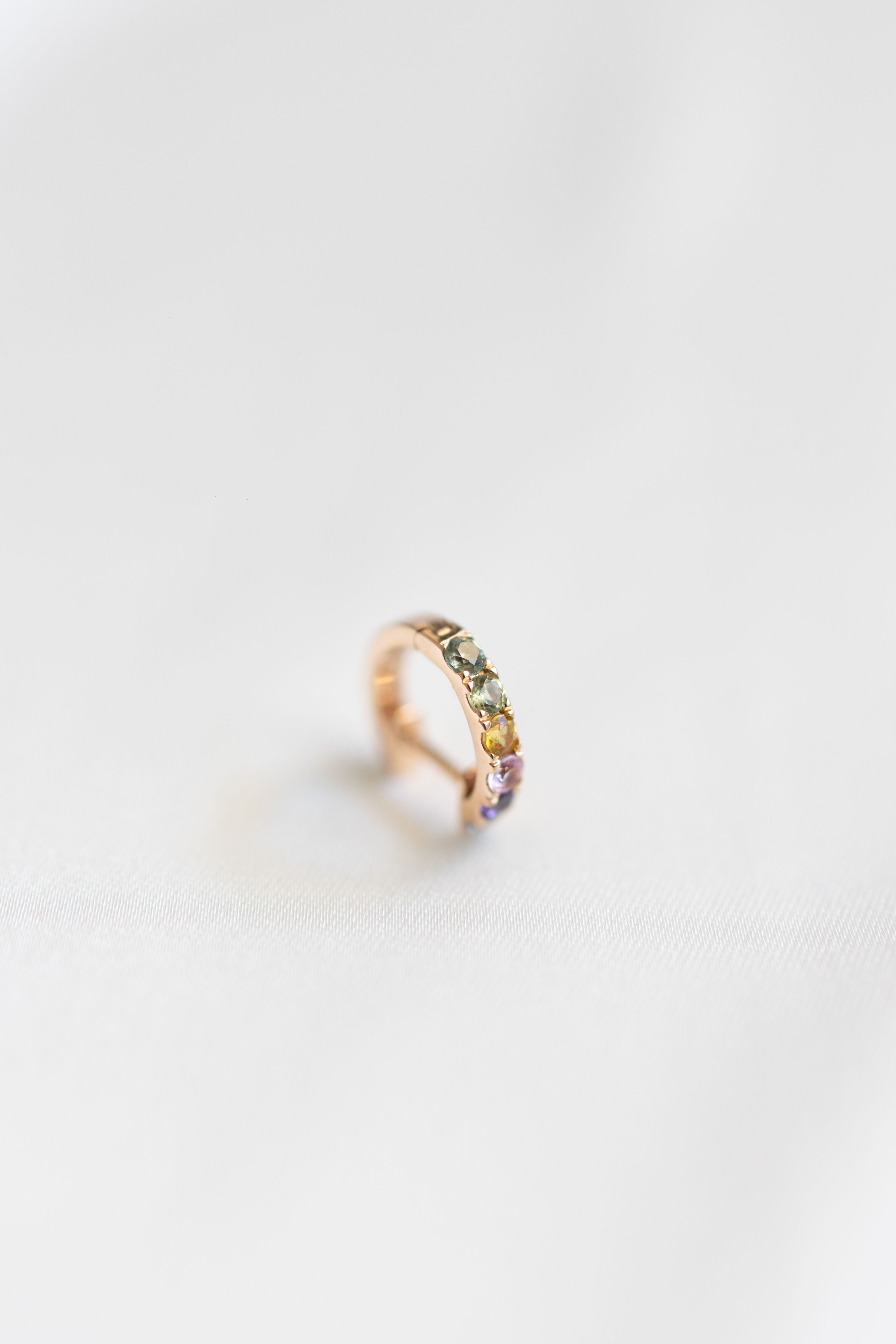 The Journey Hoop signature pastel rainbow is set in the three golds. This special piece has been designed as an exclusive piece for Alkemistry, Selfridges and Harvey Nichols online. With its softer colour hues; Alice has designed it with the aim to make it an extension to its wearer’s skin colour.