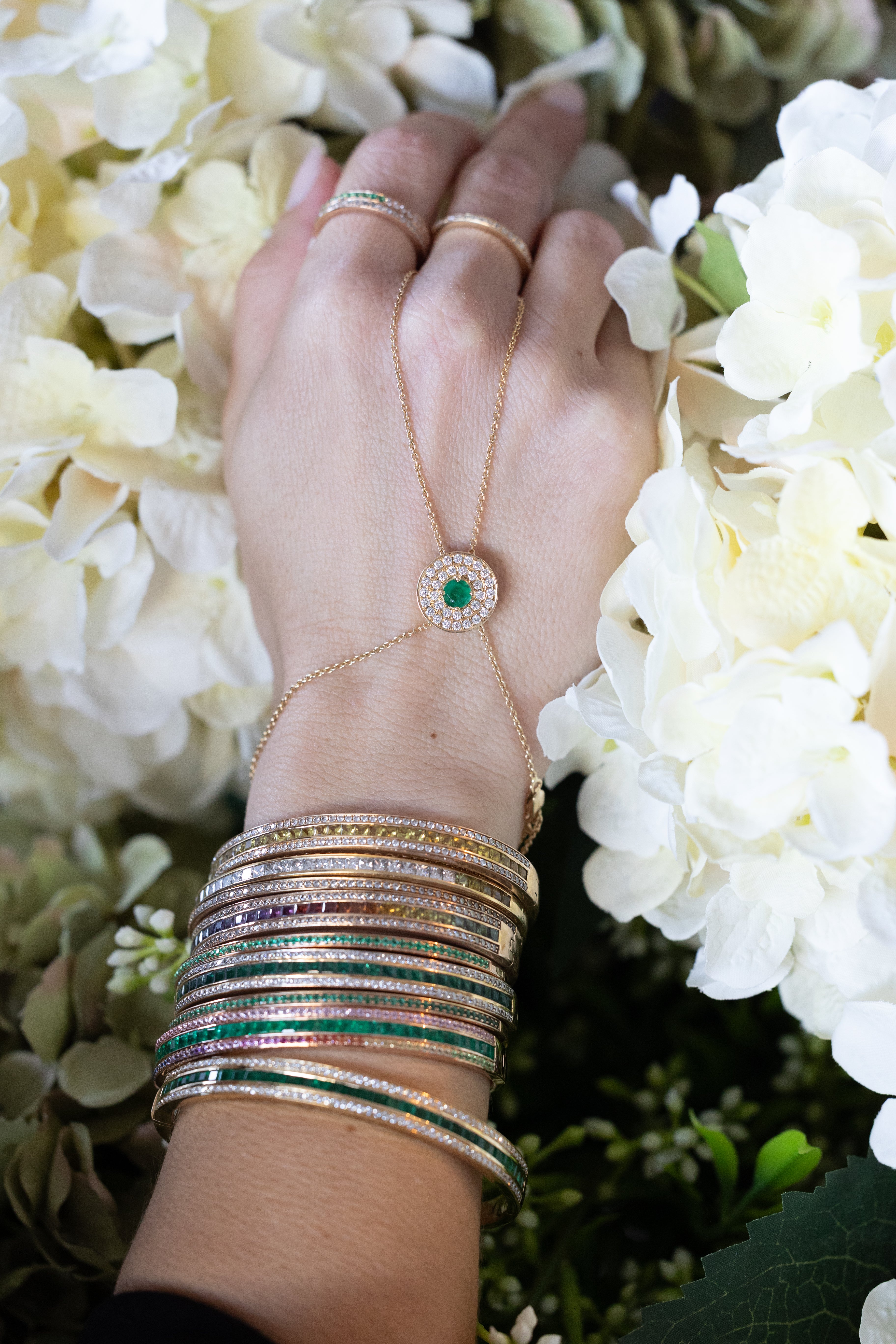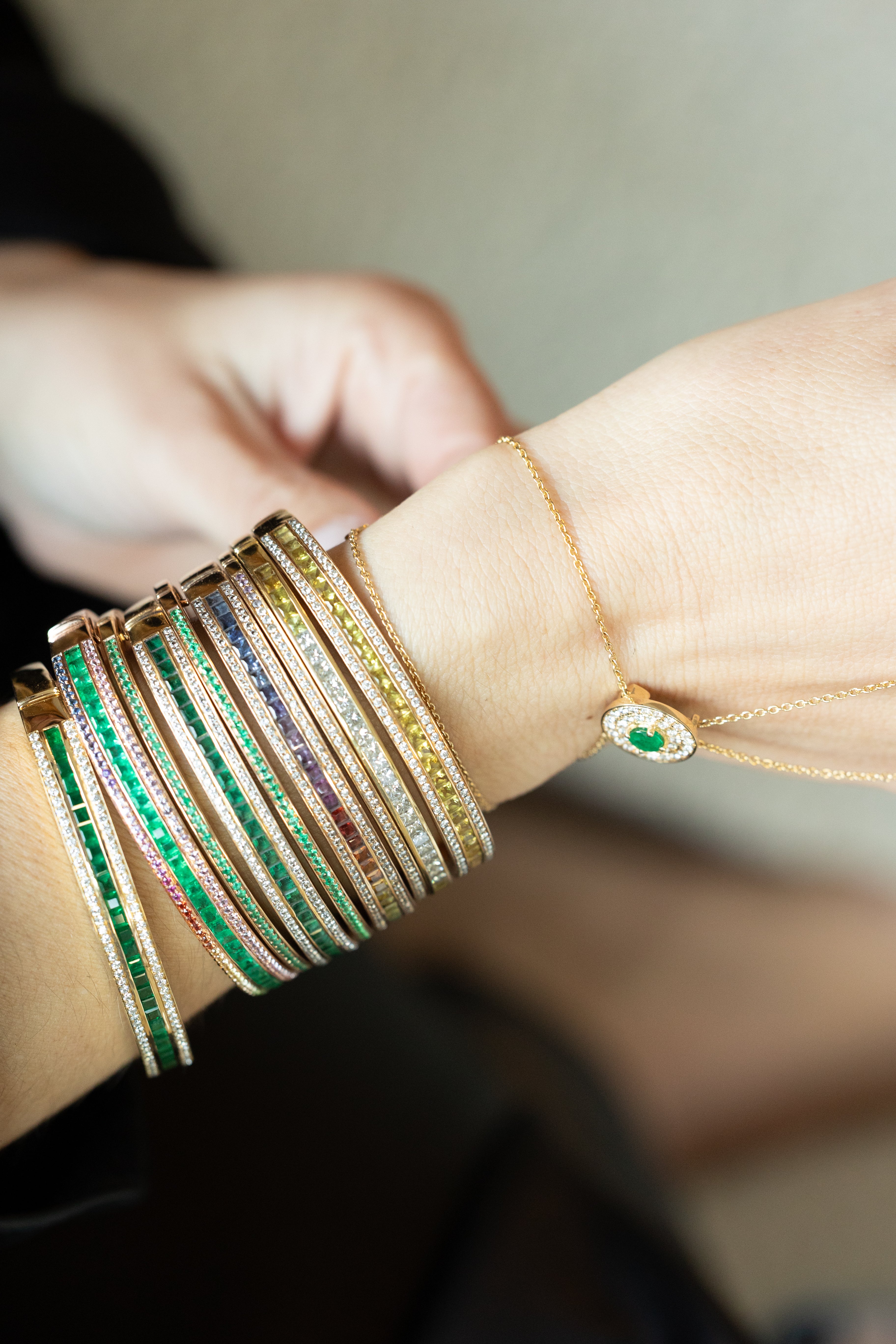 I designed a rainbow to symbolise the whirlpool of emotions that can come at certain moments of our lives, for me it was when I went through my first pregnancy. The sourcing of the Sapphires for this bracelet took months as I wanted to create a mesmerising rainbow with the most perfect transition between each stone.